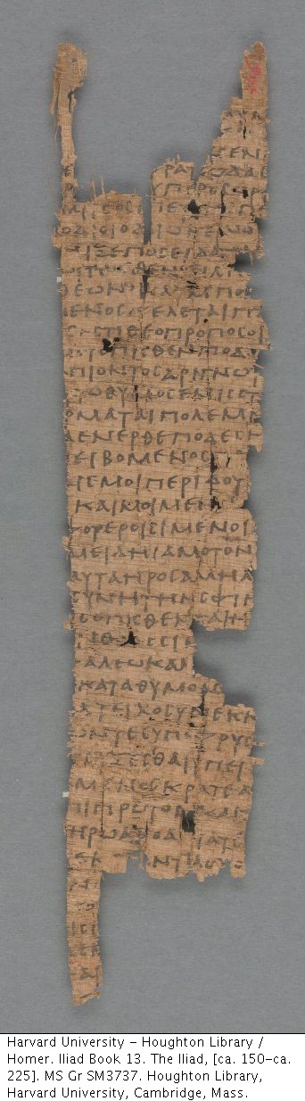 "Manuscript consisting of 42 partial lines of text from the Iliad on the recto, and on the verso words from ca. 20 lines of a dated account give an approximate terminus ad quem for the recto. Fragment from a papyrus roll."